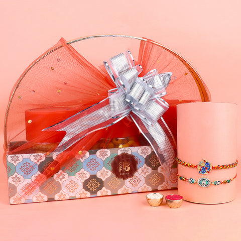 Accompanying the Rakhi is a thoughtfully curated gift hamper, designed to delight your dear Bhaiya with a selection of his favorite treats, chocolates, or thoughtful keepsakes. The hamper is carefully packed, ensuring that every element is of the finest quality and chosen with love, making it a truly heartwarming gift.